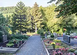 Der Friedhof ist eine von Hecken eingefasste trapezförmige Anlage. Das Friedhofskreuz von 1856 gliedert sich in einen hohen Sockel aus Trachyt, eine Muschelnische sowie das nach oben abschließende Kreuz mit Dreipassenden und einem Steinkorpus. Im Südosten des Friedhofs befindet sich eine Christusfigur aus Terrakotta auf Grottenwerk.[3]:211