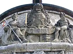 Das Wappen des Fürstbischofs Adam Friedrich von Seinsheim, der zur Förderung des Maingüterverkehrs selbst den Bau veranlasst hatte, flankiert von den Göttergestalten Franconia (Schutzgöttin und Personifikation Frankens) mit Rennfähnlein und Moenus (Flussgott und Fluss Main) ist in die dem Main zugewandte Kranmauer eingelassen.