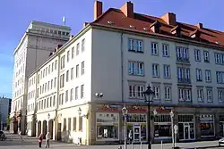 In der Zeit der DDR erfolgte dann ein Wiederaufbau der Innenstadt, der sich weitgehend nicht an die historisch gewachsene Stadtstruktur hielt. So entstand an der Stelle der vielfältigen Vorgängerbebauung die Häusergruppe, die auch die historischen Altstadtstraßen Lödischehofstraße und Fettehennenstraße überbaute. Bekannte Vorgängerbauten waren das Haus Zum goldenen Greif und das Innungshaus der Gewandschneider.