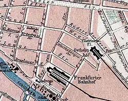 Die Baukosten betrugen etwa eine halbe Million Taler. Am 1. Oktober 1867 feierlich eröffnet[2] war der Bahnhof lediglich bis 1882 für den Personenverkehr in Betrieb: Mit Eröffnung der Stadtbahn wurde der damalige – knapp 400 Meter südwestlich liegende – Frankfurter Bahnhof zum Durchgangsbahnhof umgebaut und der Personenverkehr der Ostbahn über den neuen Schlesischen Bahnhof auf die Stadtbahntrasse geleitet. Die Empfangshalle und die Bahnsteighalle des alten Ostbahnhofs wurden geschlossen und die übrigen Anlagen an der damaligen Bromberger Straße (heute: Helsingforser Straße) nur noch für den Güterverkehr der Ostbahn genutzt.