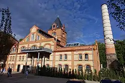 Der historisierende, an romanische Stilformen orientierte Jugendstilbau wirkt durch seine charakteristische Silhouette, prägend ist der massive, quadratische, mit einer pyramidalen Haube versehene Uhrturm sowie der Schornstein. Der kaum zu überschauende Gebäudekomplex wirkt durch die verwendeten Materialien, lachsfarbene und cremefarbene Klinker sowie den grauen Lungstein einheitlich und enthält viele Schmuck- und Gliederungselemente wie Fenster, Gesimse und Blendarkaden.