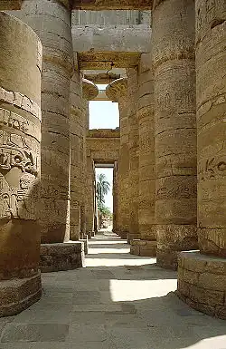 Herausragende Beispiele der ägyptischen Monumentalarchitektur sind die Pyramiden von Gizeh aus der 4. Dynastie, der über Jahrhunderte erweiterte Tempelkomplex von Karnak, der Tempel von Abu Simbel aus der Zeit Ramses II. sowie die Totentempel von Deir el-Bahari, darunter der Tempel der Hatschepsut. Die ägyptische Architektur zeichnet sich durch eine präzise Ausrichtung nach astronomischen Prinzipien und eine geschickte Integration in die Landschaft aus.