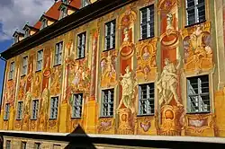 Johann Jakob Michael Küchel gestaltete das Rathaus in den Jahren 1744 bis 1756 im Stile des Barock und Rokoko um. Erwähnenswert sind die ursprünglich 1755 von Johann Anwander geschaffenen Fassadenmalereien, die vielfach restauriert wurden. Nachdem von diesen Bemalungen in den 1950er Jahren nicht mehr viel zu sehen war, wurde durch den Kunstmaler Anton Greiner in den Jahren 1959 bis 1962 eine Neubemalung vorgenommen. Beide Gebäudeseiten sind vollständig mit nachempfundenen allegorischen Szenen und architektonischen Details, der typischen Illusionsmalerei in dieser Zeit, verziert. Kleine, tatsächlich figürlich gestaltete Elemente an der östlichen Seite verstärken den räumlichen Eindruck. So kann bei genauerem Hinsehen ein figürlich gestaltetes Bein einer Putte entdeckt werden, welches aus dem Wandgemälde herausragt. Dadurch entsteht die Illusion einer mehrperspektivischen Figur. Die Rokokobalkons und Wappenreliefs stammen von Jos. Bonaventura Mutschele.[2]