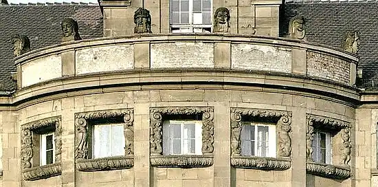 Zwei große Zwillingsfenster flankierten zu beiden Seiten den Vorbau. Weibliche Atlanten schmückten die Mittelpfosten der Zwillingsfenster. Sie dienten als architektonische Stützen für zwei Dreiecksgiebel über den Fenstern, die mit kleinen Skulpturen, mythologischen Fabelwesen, wie Greif, Pegasus, Sphinx, Meerjungfrau und Wassermann, geschmückt waren. Die Skulpturen an den Laibungen stellten ebenfalls mythologische Fabelwesen dar, wie geflügelte Drachen, Meerjungfrauen, Greifvögel, Raubkatzen und Harpyien.[2][9][53] Alle Skulpturen waren nach dem Vorbild der „phantasievollen, dämonischen Ornamentik des Kiliansturmes“[53] von den Bildhauern Bauer, Gräter und Lehmann in Heilbronn[9] nach Modellen von Jakob Wilhelm Fehrle geschaffen worden.[54]