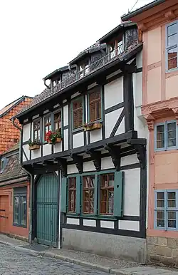 Das traufständige, zweigeschossige Fachwerkhaus ist sieben Gefache breit und wurde noch im Stil der Spätgotik gebaut. Die Tonne des Sandsteinkellers wird durch eine Inschrift auf 1520 datiert. Das obere Geschoss kragt weit über. Als zierende Elemente finden sich mit Schnitzwerk versehene Bügen und Fußbänder. In der östlichen Hälfte des Hauses besteht eine große Tordurchfahrt. Der Dachstuhl ist dendrochronologisch in das Jahr 1521 datiert. In älterer Literatur wurde als Bauzeit noch der Zeitraum um 1550 angenommen.[1]