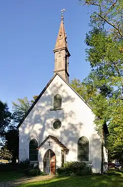 An dem Rechteckbau mit Satteldach befindet sich an der Eingangsfassade im Westen ein kleiner Vorbau. Auf der Westseite bekrönt ein zur Spitze pyramidenförmiger Dachreiter das Dach. Die Südwand hat fünf Spitzbogenfenster; die Nordwand und die Giebelwände jeweils zwei.