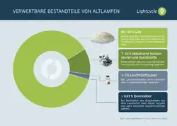 - 80–90 % Glas. Hierbei handelt es sich hauptsächlich um Natron-Kalkglas, das bei der Produktion neuer Lampen eingesetzt wird.