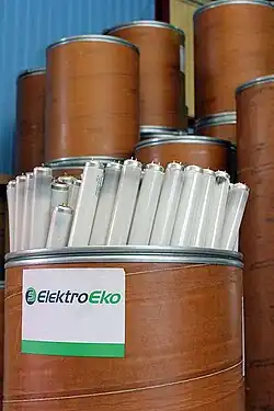 Aus diesem Grund müssen ausrangierte Kompaktleuchtstofflampen und Leuchtstoffröhren getrennt von anderem Müll gesammelt und fachgerecht entsorgt werden. Obwohl LED-Lampen kein Quecksilber enthalten, wohl aber elektronische Bauteile, müssen auch sie gesondert entsorgt werden.[4]