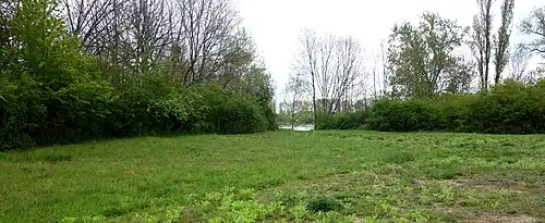 Im nordwestlichen Bereich geht die Fläche in eine Grünlandbrache über, in der überwiegend das Land-Reitgras gedeiht. Durch die Hunds-Rose ist dieser Bereich stark verbuscht. Südlich und nordwestlich der Fläche liegen zwei Ackerflächen, während sich südöstlich oberhalb einer Geländekante eine magere artenreiche Grünlandbrache erstreckt. Eine brachgefallene Obstwiese mit teilweise abgestorbenen alten Obstbäumen befindet sich am östlichen Rand der Fläche. An eine südlich der Obstwiese angrenzende Ackerfläche schließt sich im Süden ein kleines Feldgehölz aus Weiden und Pappeln an. Eine vom Wiesen-Fuchsschwanz dominierte Wiese mit vier starken Pappeln und welligem Relief liegt östlich des Ackers. Als Lebensraum für bedrohte Pflanzen- und Tierarten kommt dieser Fläche eine besondere Bedeutung zu.