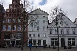 Wohn- und Geschäftshaus | Das Haus befindet sich an der Ecke zur Großen Bäckerstraße. Das heutige Haus wurde 1895 erbaut. Bauherr war der Kaufmann Arnold Jacobsen (gestorben 1933), ein Mitglied der Lüneburger Synagogengemeinde. Es ist viergeschossig im Stil der Neugotik. | 30674178 |