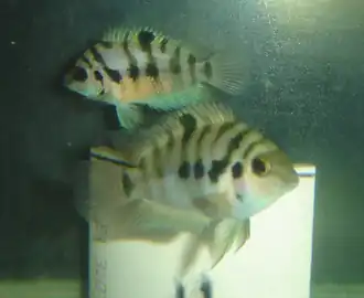 Zebrabuntbarsch (Amatitlania nigrofasciata), die Typusart der Gattung | ||||||||||||