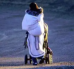 Das typische Kleidungsstück der Karibu-Inuit im 19. Jahrhundert waren perlenverzierte Parkas mit langen, breiten vorderen und hinteren Schößen.[21] Auch für die Karibu-Inuit wird vermutet, dass in den Fellstiefeln von den Frauen Kleinkinder transportiert wurden. Eine Inuitfrau gab in den 1980er Jahren eine andere Erklärung: Die Stiefeltaschen seien dazu benutzt worden, Karibu-Windeln aufzubewahren und zu trocknen. Diese „Windel“ war ein großes Stück Karibufell, das unter das nackte Baby gelegt wurde, bevor es in die Amautitasche der Mutter kam. Die benutzte Windel ließ sie gefrieren und säuberte sie danach mit der Geweihzacke eines Karibus oder mit einem stumpfen Schaber, anschließend steckte sie die Windel in eine der beiden Stiefeltaschen zum Trocknen. Eine dritte, bereits trockene Windel befand sich in der Tasche des zweiten Stiefels.[10]