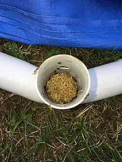 - Umsiedlung: Bei der Umsiedlung eines Ameisenvolks wird ein mit Nestbaumaterial befülltes Gefäß auf oder neben das Nest gestellt oder darüber gestülpt. Hierfür eignet sich beispielsweise ein großer Blumentopf (aus Ton), der mit feuchtem Stroh, Holzwolle oder Holzspänen gefüllt wurde. Ist das Volk, nach einigen Tagen bis einer Woche, in das Gefäß umgesiedelt, wird dieses an einem entfernten Ort wieder ausgesetzt.[1][5]
