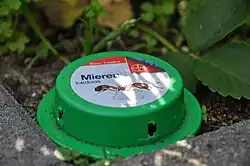 - Vergiftung: Insektizide werden als Granulat, Gel, Zusatz von Gießwasser, Spray oder in speziellen Köderdosen in der Nähe der Ameisenstraße oder des Nestes appliziert. Da die Arbeiterinnen eines Ameisenstaates den Wirkstoff der Köder auch als Futter ins Nest verschleppen, wo das Gift die Königin erreicht, wird die ganze Kolonie betroffen. Im öffentlichen Bereich, wie auf Spielplätzen oder im Außenbereich von Kindertagesstätten werden unter anderem Giftstoffe wie Fipronil, Permethrin und Cyhalothrin eingesetzt.[10]