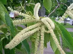 Die Amerikanische Kastanie ist einhäusig monözisch. Die Blüten duften unangenehm. Die funktionell männlichen Blüten stehen in achselständigen, schlanken Kätzchen. Die weiblichen Blütenstände stehen zu wenigen am Grund der oberen männlichen Blütenstande.