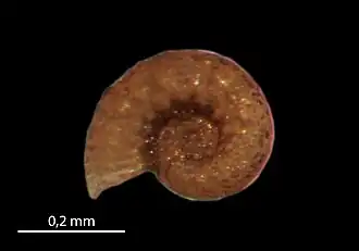 Die eng gewickelten, planispiralen und sehr kleinen Gehäuse messen im Adultstadium 0,34 bis 0,46 mm im Durchmesser (0,2 bis 0,4 mm nach Emilio Rolán), und etwa 0,13 mm in der Höhe. Das Gehäuse hat bis 2,6 Windungen. Davon nimmt der Protoconch mit 120 bis 135 μm Durchmesser etwa 1,3 Windungen (eine Dreiviertelwindung nach Rolán) ein. Er hat eine Ornamentierung bestehend aus je einer seitlichen, sehr kräftigen Längsrippe, die nach innen von drei bis vier spiraligen Längslinien begleitet wird. An der Peripherie ist ein kräftiges retikulates Muster ausgebildet.