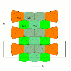 Die Oktaeder der C-Position sind über gemeinsame Kanten zu idealerweise unendlichen Oktaederbändern verknüpft. Die B-Position liegt an den Rändern der Oktaederbänder und stellt die Verbindung zu benachbarten SiO4-Tetraederdoppelketten her.