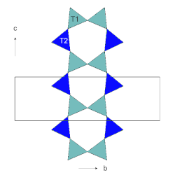 Es ergeben sich zwei strukturell unterschiedliche SiO4-Tetraeder. Der Tetraeder T1 verbindet die beiden Zweier-Einfachketten zu einer Zweier-Doppelkette und ist über drei Sauerstoffe mit benachbarten SiO4-Tetraedern verbunden. Das Tetraeder T2 ist nur über zwei Sauerstoffe mit benachbarten SiO4-Tetraedern verbunden.