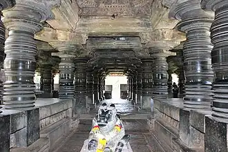 Der um das Jahr 1196 entstandene und größtenteils aus Speckstein erbaute Lakshmi Devi-Tempel ist die Stiftung eines wohlhabenden Militärs am Hof des Hoysala-Herrschers Vira Ballala II. (reg. ca. 1173–1220); er ist dem Hindu-Gott Shiva geweiht, doch in der Cella (garbhagriha) befindet sich auch ein Steinbildnis der lokal verehrten Göttin Sharadha Devi. Der von einem gestuften Turm (vimana) mit abschließender ‚Schirmkuppel‘ und Vasenaufsatz (kalasha) überhöhte Tempel folgt dem älteren Ein-Cella-Typus (ekakuta); er hat zwei Vorhallen (mandapas), deren Äußere sehr eigenwillig konstruiert ist: Ihr aus großen Steinplatten bestehendes und mit einer reichverzierten, beinahe zinnenartigen Brüstung umgebenes Dach ruht nämlich auf mehreren undekorierten Basaltpfeilern, die in Abständen die mit kleinen Tempeltürmen und zahlreichen Brüstungsreliefs verzierte Außenhaut der Vorhalle umschließen. Im Innern des Tempels befinden sich ein liegender Nandi-Bulle, das Begleittier (vahana) Shivas, sowie die charakteristischen gedrechselten Speckstein-Säulen der Hoysala-Architektur; die Deckensegmente enthalten reich dekorierte Kragkuppeln mit hängenden Schlusssteinen (Abhänglingen).