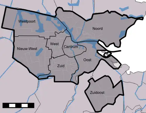 Amsterdam ist seit der Neugliederung am 1. Mai 2010 in sieben + einen (= das Gewerbe- und Industriegebiet Westpoort) Stadtbezirke unterteilt. Davor gab es 14 Bezirke, von denen drei unverändert blieben und die anderen zu vier neuen Bezirken fusionierten. Mit dem 24. März 2022 wurde die bis dahin selbständige Stadt und Gemeinde Weesp als neunter Stadtbezirk nach Amsterdam eingemeindet.[6] Jeder Stadtbezirk hat eine eigene Bezirksverwaltung und ein gewähltes Bezirkskomitee. Die Stadtbezirke sind wiederum in die nachfolgend aufgelisteten Stadtteile von Amsterdam (niederländisch wijken) unterteilt.[7] Darüber hinaus ist jeder Stadtteil in seine einzelnen Wohnviertel (buurten) gegliedert.