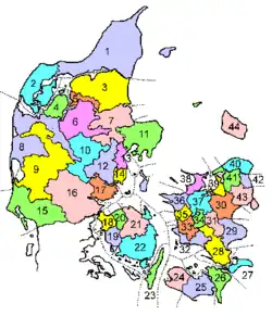 | 14 | Åkær Amt | 29 | Tryggevælde Amt | 44 | Bornholms Amt |