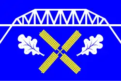 Blasonierung: „In Blau unter der stilisierten silbernen Kanalbrücke bei Hochdonn ein goldenes Flügelkreuz einer holländischen Windmühle über zwei auswärts gewendete silberne Eichenblätter.“[2]