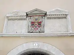 Blasonierung: Geteilt von Gold mit einem schwarzen Adler und von Rot mit einem goldenen Sparren.