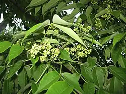 Die gegenständigen, gestielten und unpaarig gefiederten Laubblätter sind etwa 25 bis 40 Zentimeter lang. Es sind 7 bis 13, fast kahle, kurz gestielte, fast ganzrandige bis schwach gesägten, bis 11 Zentimeter lange, leicht ledrige Fiederblättchen vorhanden. Diese sind eiförmig und zugespitzt bis geschwänzt mit gekrümmter Spitze. Die Blättchen sind oberseits glänzend dunkelgrün. Am Blattrand befinden sich Öldrüsen. Die Blattspindel und die Mittelrippen der Blättchen sind gelblich. Unterseits sind die Blättchen heller und manchmal auf den Adern behaart. Zerrieben riechen die Blättchen stark würzig. Das Laub färbt sich im Herbst hellgelb. Die Nebenblätter fehlen.