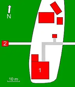 Der hochgelegene, über einen steilen Weg, aber auch über eine Straße zu erreichende Tempelbereich besteht aus der Haupthalle (本堂; Hondō; im Plan 1) und dem Oku-no-in (奥の院). Daneben gibt es noch Gebäude der Mönche.