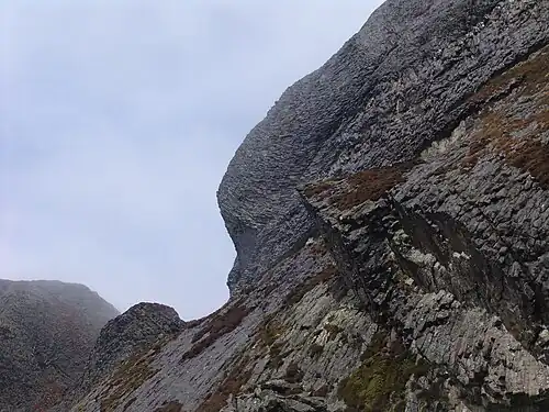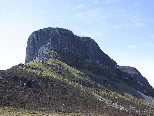 | Der 393 Meter hohe An Sgùrr. Der imposante Gipfelaufbau besteht aus der Sgurr-of-Eigg-Pitchstone-Formation, die sich diskordant über die Eigg-Lava-Formation gelegt hat. | ||