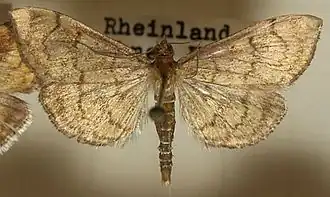 Die Flügelspannweite der Falter beträgt 22 bis 26 Millimeter[1][2] (bzw. die Vorderflügellänge 10 bis 11 Millimeter[3]). In der Grundfarbe sind die Flügel gelblich braun mit mehr oder weniger intensiver bräunlicher Überstäubung. Die Vorderflügel weisen zwei Querlinien auf, die äußere mit einer starken mittigen Ausbuchtung, die innere Querlinie ist dagegen nur leicht gebogen. Der Rücksprung nach der gezackten Ausbuchtung ist zum Innenrand hin viel stärker als zum Kostalrand. Ein Queraderstrich zieht sich vom Kostalrand zum Rücksprung der äußeren Querlinie. Von der Flügelwurzel bis etwas über den Queraderstrich hinaus zieht sich ein dunkler Längsstrich, oft gesäumt von einem hellen Streifen. Oft sitzt nur wenig außerhalb der inneren Querlinie ein weiterer, sehr kurzer Queraderstrich, der ebenfalls vom Kostalrand ausgeht. Bei manchen Exemplaren hebt sich der disko-zellulare Fleck deutlich hell ab. Auch die Ausbuchtung der äußeren Querlinie kann hell hervorgehoben sein. Im Außenfeld ist eine schwach gebogene, gezackte Schattenlinie ausgebildet. Die Saumlinie ist dunkel und meist sehr dünn hell gesäumt. Der Hinterflügel hat die gleiche Grundfarbe wie der Vorderflügel. Er weist eine zweimal fast rechtwinklig gebrochene Querlinie sowie eine Schattenlinie auf.