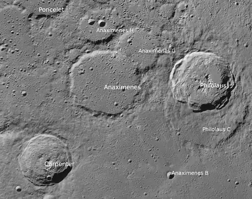Anaximenes ist ein Einschlagkrater auf dem Mond am nordwestlichen Rand der Mondvorderseite. Er liegt zwischen den Kratern Carpenter im Südwesten und Philolaus im Osten. Die Kraterwälle sind stark erodiert.