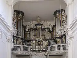 30[17] | 1914 beim Abbruch der Vorgängerkirche blieben weder das Pfeifenwerk noch das Barockprospekt erhalten. Lediglich sieben Pfeifenreihen wurden noch bis 1938 in einer kleinen Orgel in St. Kilian genutzt.[18] | |