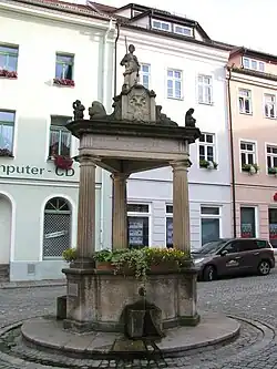 Der Brunnen wurde um 1570 im Stil der Spätrenaissance erbaut. Der Aufbau besteht aus drei ca. 1,70 Meter hohen Säulen in toskanischer Ordnung mit abgerundeten Kannelüren. Auf ihnen ruht ein baldachinartiger Aufbau, der in Antiquaschrift umlaufend Hinweise auf den Stifter trägt. An jeweils einer Seite sind als Bildhauerarbeiten die Wappen von Kamenz, des Königreiches Böhmen und des Deutschen Reiches, an den Ecken Puttenfiguren angebracht. Der Brunnen wird von einer Justitia mit Schwert und Waage, als Sinnbild der Gerechtigkeit, gekrönt. Eine Mitarbeit des Dresdner Bildhauers Christoph Walther II (1534–1584) wird nicht ausgeschlossen. Vergleichbare Brunnenanlagen sind von Gregor Richter aus Leipzig und Oschatz bekannt.[1]