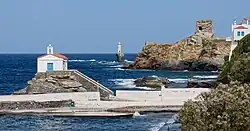 Zum Beginn des hellenistischen Zeitalters erhielt die Insel eine makedonische Besatzung, von der sie durch den ägyptischen König Ptolemaios I. befreit wurde.[13] Bald darauf gehörte sie dem Nesiotenbund an. Um 250 v. Chr. war sie abermals im Besitz Makedoniens. Der mit den Römern verbündete König Attalos I. von Pergamon eroberte während des Kriegs, den die Römer gegen König Philipp V. führten, um 200 v. Chr. Andros.[14] Nach dem Tod des Königs Attalos III. (133 v. Chr.) fiel die Insel mit der übrigen pergamenischen Erbschaft an Rom. In der frühbyzantinischen Epoche verlagerte sich die Besiedlung in den Nordosten von Andros.