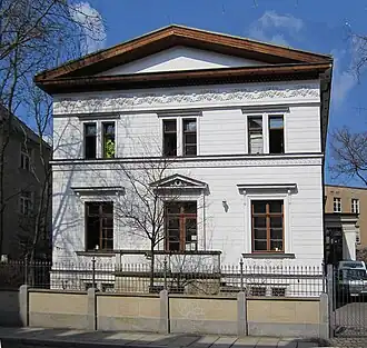 Der in offener Bauweise im Abstand von etwa vier Metern zur Straße stehende klassizistische Bau ist zweistöckig mit drei Fensterachsen zur Straße. Das Haus besitzt eine gequaderte Putzfassade und kräftige Fensterverdachungen. Erd- und Obergeschoss sind durch ein schmales Gesims mit Mäanderband getrennt. Unter dem Hauptgesims mit Zahnschnitt verläuft ein breiter Fries mit Blattornamentik.[2] Der Zugang zum Haus ist am Giebel und der linken Längsseite über schmale Außentreppen und einen umgrenzten Austritt möglich, der an der Längsseite überdacht ist. An der Rückseite des Hauses ist ein einachsiger Anbau angefügt.