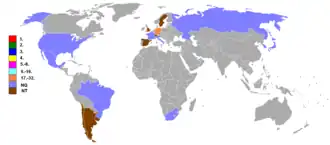 - ↑ Die Platzierungen ab Platz 5 wurden von der FIFA festgelegt, ohne dass es dafür Platzierungsspiele gab. Siehe: All-time FIFA World Cup Ranking 1930–2010 ( vom 22. Juli 2014 im Internet Archive) (PDF; 200 kB)