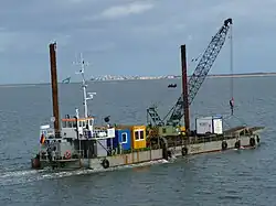 Arbeitsschiff Krake mit zwei Ankerpfählen