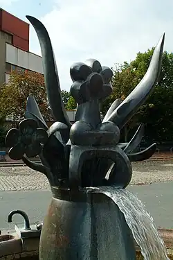 Der Anna-Blume-Brunnen vor dem ehemaligen Gebäude der IGS Mühlenberg und dem Freizeitheim Weiße Rose