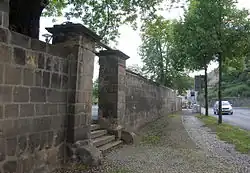 Erhalten blieben nur Teile der ebenfalls denkmalgeschützten Grundstückseinfriedung. Sie besteht aus einer hohen Sandsteinmauer.