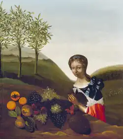 Das Gemälde von Anna Cornelia Holt zeigt eine junge Frau, die ein Blatt in einer kargen Hügellandschaft mit einigen Bäumen hält. Der Vordergrund wird durch ein Stillleben ausgefüllt, welches aus einheimischen und exotischen Früchten, auf dem ein Schmetterling ruht, besteht. Es ähnelt in seiner Komposition stark dem (Selbst-)Porträt ihrer Cousine Aleida Greve. Anna Cornelias Werk könnte auch ein Selbstporträt sein. Sie signierte ihr Gemälde mit „Cornelia Holt“. Die collagierte Struktur des Raumes lässt das Gemälde sehr zeitgenössisch wirken. Das Bild ist erhalten, es befindet sich mit den Gemälden ihrer Verwandten im Salon des Vrouwenhuis in Zwolle. Die Komposition der Bilder dort ist eine Besonderheit, da sie über die Jahrhunderte gemeinsam erhalten geblieben sind.[3]