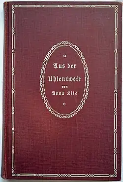 Karl August Baumeister, ein in München lebender Onkel Anna Klies und selbst Schriftsteller, machte sie mit dem späteren Literaturnobelpreisträger Paul Heyse und dessen Werk bekannt. Heyse führte Klie in die Literatur ein.[8] Von der zwischen etwa 1870 und 1940 sehr verbreiteten sogenannten „Backfischliteratur“ hebt sich Anna Klies Werk, das sie ausschließlich unter ihrem Mädchennamen veröffentlichte, dadurch ab, dass in ihm nicht tradierte Rollen-Stereotype geschildert und bedient, sowie süßlich verbrämte und überzeichnete, unrealistische Mädchenträume geschildert wurden, sondern vielmehr die Lebensrealität junger Frauen der Gegenwart im Deutschen Kaiserreich um 1900.[9] In ihrem 1895 erschienenen Buch Viktoria Erika. Eine Erzählung für die junge Mädchenwelt schilderte Klie realistische, zeitgenössische Lebensumstände. In Das blonde Schneiderchen von 1904, das Leben einer Lehrerin und in Schwester Idaly von 1908 betonte sie die Bedeutung eines praktischen Berufes für junge Frauen, in diesem Fall den einer Krankenschwester.[10] Einige ihrer Bücher, zum Beispiel Aus Braunschweigs Vergangenheit von 1902 und Aus der Uhlentwete von 1909, haben einen deutlichen Bezug zur Stadt Braunschweig und deren Umgebung, zum Beispiel dem südlich der Stadt gelegenen Harzvorland. Einige ihrer Gedichte, darunter Für Kinderherzen von 1894, wurden später von Peter Gast vertont.[11]