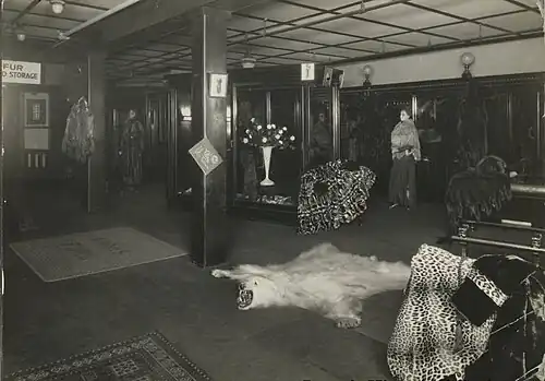 - Im Untergeschoss „große moderne Pelzaufbewahrungsanlagen für Kundenpelze“, zusammen mit Pelzen der auf Pelzaufbewahrung für andere Pelzanbieter spezialisierten Murphy Cold Storage Co.[14]