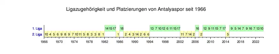 Der Verein wurde im Sommer 1966 durch eine Fusion der örtlichen Vereine Yenikapı Su Spor, İlk Işık Spor und Ferrokrom Spor in Antalya als Antalya Spor gegründet.[4] Antalyaspor spielte 13 Jahre in der ersten türkischen Liga. Antalyaspor spielte professionell ab der Saison 1966/67 in der 2. Liga. In der Saison 1981/82 wurde der Klub Meister und stieg in die Süper Lig auf.[4] Nach drei Saisons stieg er wieder in die 2. Liga ab.[4] Bereits nach einem Jahr stieg der Verein wieder auf, jedoch nach nur einer Saison wieder in die 2. Liga ab.[4] Nachdem der Verein sieben Saisons in der Zweitklassigkeit gespielt hatte, stieg er in der Saison 1993/94 erneut auf.[4] Die Mannschaft konnte sich acht Saisons in der Süper Lig halten, bis sie in der Saison 2001/02 wieder abstieg.[4] In der Saison 2005/06 wurde sie in der Ikinci Lig (Lig A) Zweiter hinter Bursaspor und stieg wieder in die Süper Lig auf.[4]