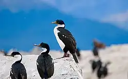 Die Familie der Kormorane gehört nicht zu den Hochseevögeln. Die mittelgroßen bis großen Vögel sind meist flugunfähig und halten sich eher in Küstennähe auf. Im Deutschen werden Kormoranarten (sprachlich) in zwei Gruppen unterteilt. Zum einen in die Scharben, zu erkennen an ihrem Schopf, zum anderen in die Kormorane, denen der Schopf fehlt.[16]