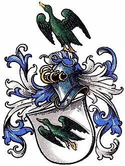 Blasonierung: In Silber eine grüne, nach rechts auffliegende Ente mit goldenem Schnabel und Füßen, die sich auf dem blau-silbern bewulsteten Helm wachsend wiederholt. Die Helmdecken in blau-silber.[3]