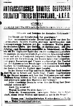 Die Konstituierung erfolgte am 10. August 1944, gleichzeitig mit einem in mehreren Zeitungen veröffentlichten „Aufruf an alle deutschen Soldaten in Griechenland“, aktiv in den Kampf gegen Hitlers Wehrmacht einzutreten. Per Telegramm wurde das AKFD durch die Leitung des NKFD in Moskau anerkannt. Ab Ende August wurden zudem regelmäßig Sendungen des NKFD aus Moskau im ELAS-Hauptquartier gehört.