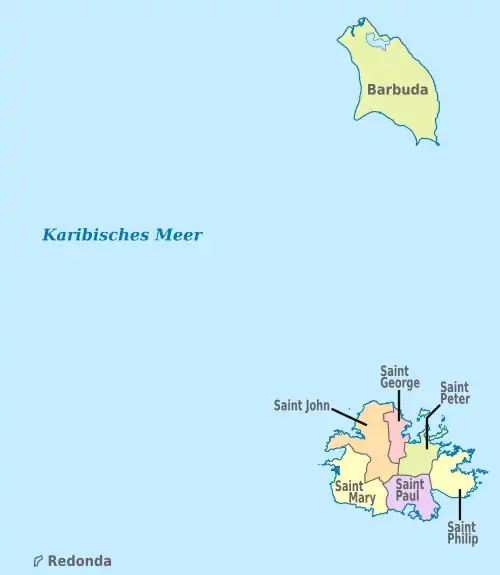 BarbudaRedondaParish of Saint Philip (Antigua und Barbuda)Parish of Saint Paul (Antigua und Barbuda)Parish of Saint Mary (Antigua und Barbuda)Parish of Saint John (Antigua und Barbuda)Parish of Saint George (Antigua und Barbuda)Parish of Saint Peter (Antigua und Barbuda)