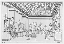 Die Antikensammlung nahm mehrere Räume des Erdgeschosses ein. Hinter dem Vestibül lag auf der rechten Seite eine Galerie der antiken Skulpturen, daran schloss sich ein Eckraum an, in dem antike Kleinkunst ab der Zeit der Ägypter präsentiert wurde, ergänzt durch Korkmodelle antiker Gebäude. Auf der anderen Seite des Vestibüls befand sich die Galerie der neuzeitlichen Skulpturen. Dort waren Bronzenachgüsse, Gipsabgüsse und Marmorkopien antiker Werke ausgestellt, außerdem auch antikisierende Figuren sowie die Marmorbüsten von Vorfahren des Landgrafen. Laut du Ry standen in der Galerie der Antiken, die 82 Fuß lang und 38 Fuß breit und durch zwei Reihen dorischer Säulen gegliedert war, unter anderem acht überlebensgroße Marmorfiguren, von denen er besonders eine Minerva, ein Abbild des Didius Iulianus und einen Paris hervorhob. Ferner erwähnte er in seiner Beschreibung der Ersteinrichtung des Museums zehn unterlebensgroße antike Marmorfiguren in diesem Saal sowie die Vorderseite eines marmornen Sarkophags, die mit einem Bacchanal verziert war. Du Ry hob besonders die Erwähnung dieses Sarkophags in Montfaucons Werk über die Kunst des Altertums hervor.[2]