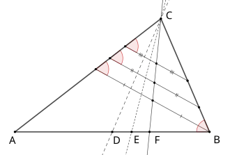 Ein Symmedian durch den Eckpunkt eines Dreiecks halbiert alle Strecken, deren Enden sich auf den am Eckpunkt anliegenden Dreieckseiten befinden und die zur gegenüberliegenden Dreieckseite antiparallel sind.[5][6]
